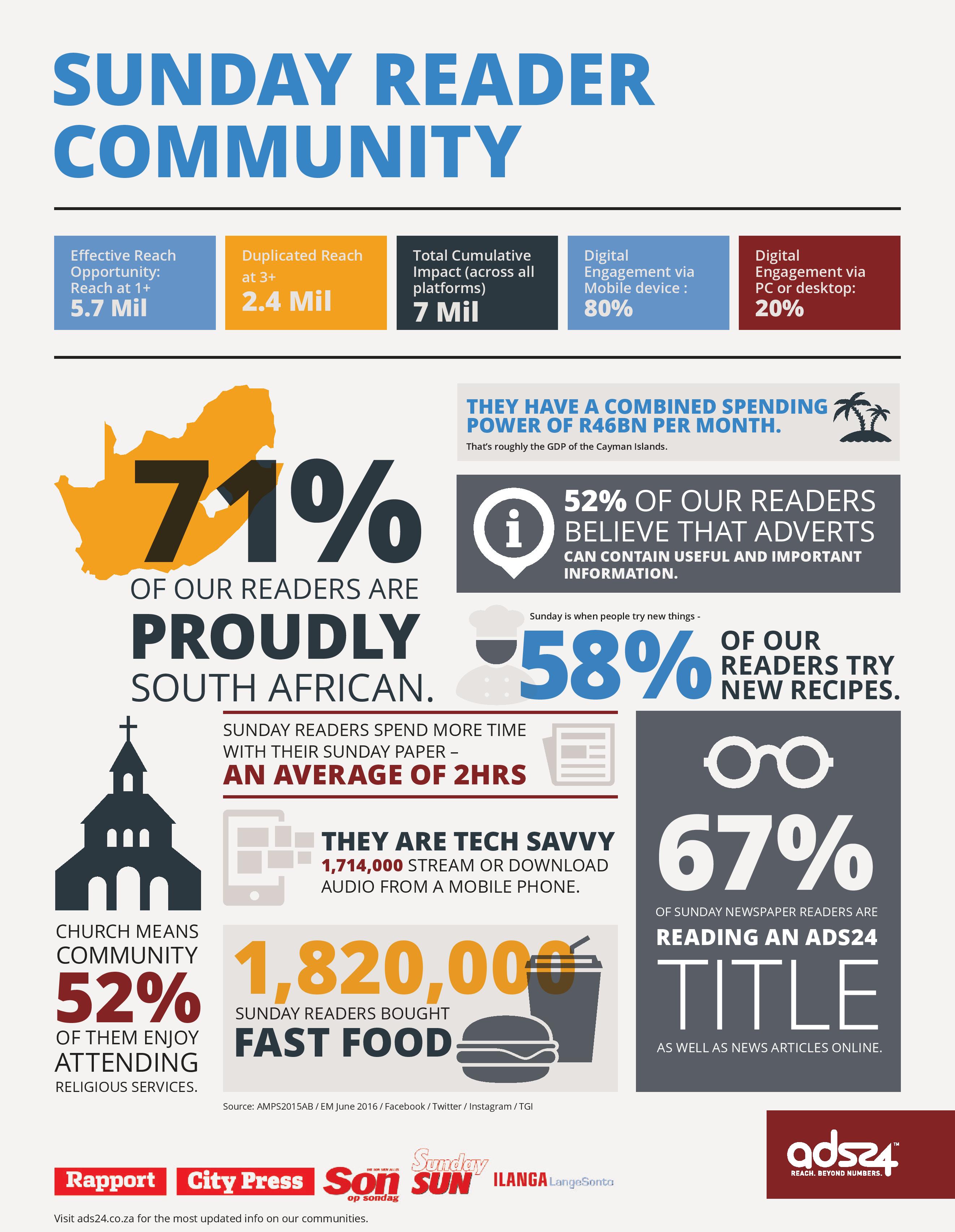 Sunday readers, it turns out, are hip and happening music lovers, over 1.7 million of them download or stream audio from a mobile phone. The Digital Engagement of Ads24’s Sunday Reader Community via a mobile device sits at 80% and via a laptop or desktop at 20%.
